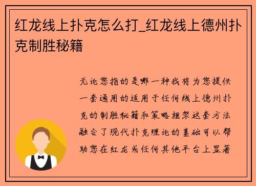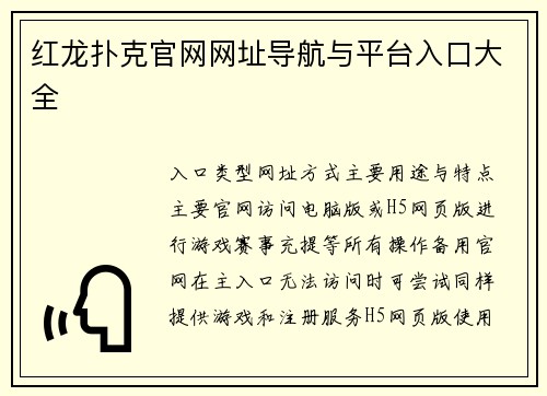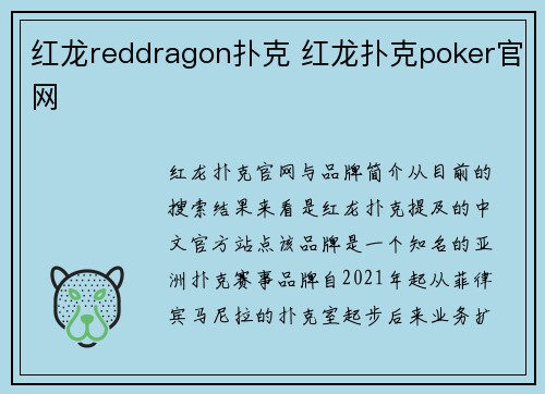 关于您提到的“红龙扑克杀猪”及其官网问题,我查阅了现有的网络信息,但未能找到一个完全权威、可确认为官方的网站。相反,搜索结果显示该平台可能存在一些争议和风险。 网上关于“红龙扑克”的说法 以下是基于搜索结果整理的信息,请您审慎参考: 平台描述:部分网页将“红龙扑克”描述为一个专注于MTT扑克锦标赛的线上平台,并声称其拥有名为“安全卫士”的AI反作弊系统。也有信息称它是一个集成了多种棋牌游戏的社交...