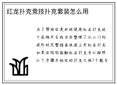 如何下载与安装 你可以根据自己使用的手机系统,参考下面的方法进行下载安装。 * 安卓手机 * 下载途径:为了确保软件安全,建议你优先访问红龙扑克的官方网站获取最新的官方安装包(APK文件)。 * 安装注意:如果手机弹出"禁止安装来自未知来源的应用"提示,你需要先在系统设置中开启"允许安装未知来源应用"的选项,才能顺利完成安装。 * 苹果手机(iOS) * 下载途径:苹果手机用户需要通过Safar...
